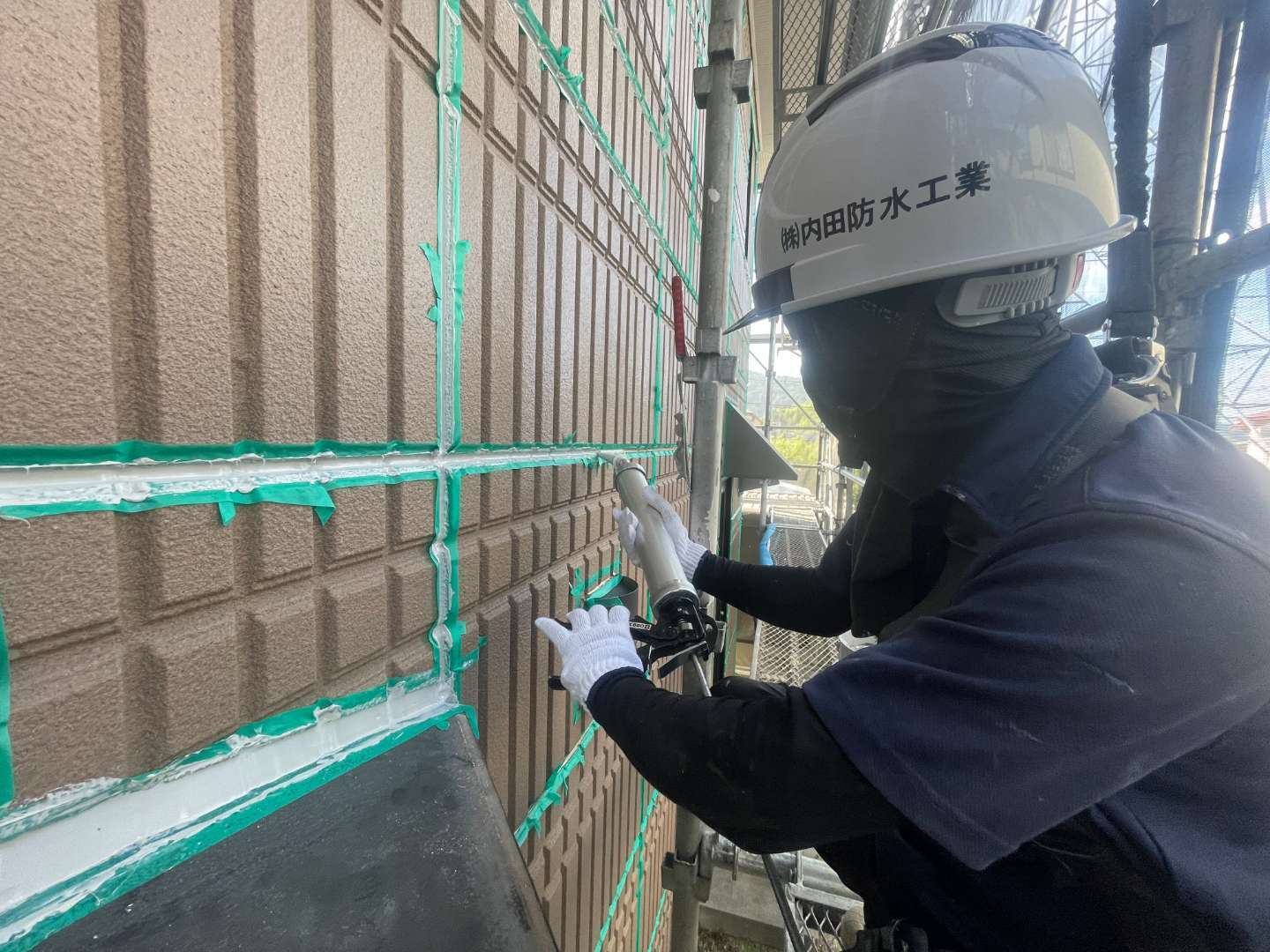 シーリング工事の現場に行ったら若手が頑張ってシールを打ってました👏